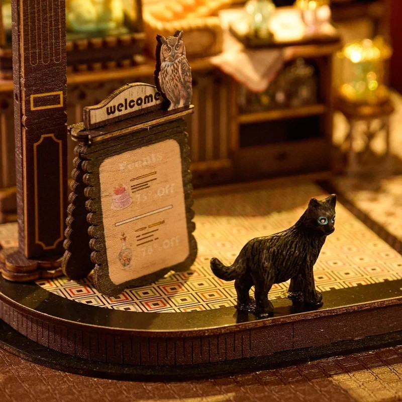 Klein, aber beeindruckend geräumiges 3D-Puzzle-Modell eines kleinen magischen Cafés, das Ihre Bibliothek zum Leben erweckt. Dieses DIY-Kit kombiniert präzise Holzstücke mit sanfter LED-Beleuchtung und schafft eine sentimentale Mini-Szene mit der Atmosphäre eines geheimnisvollen Ladens.