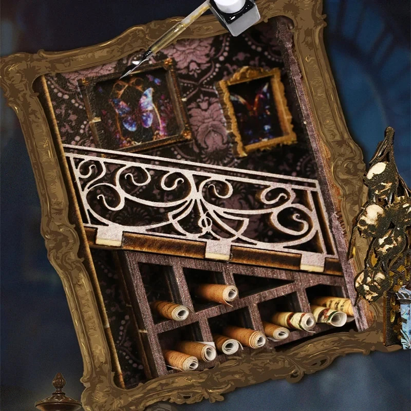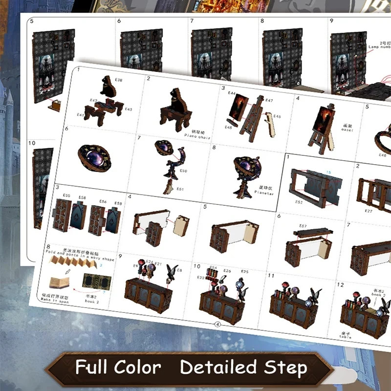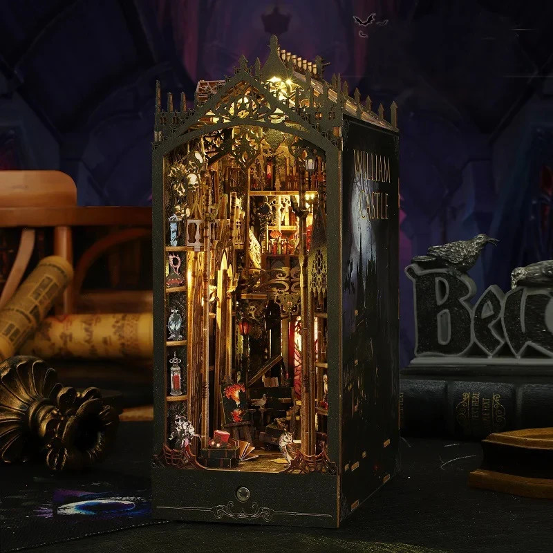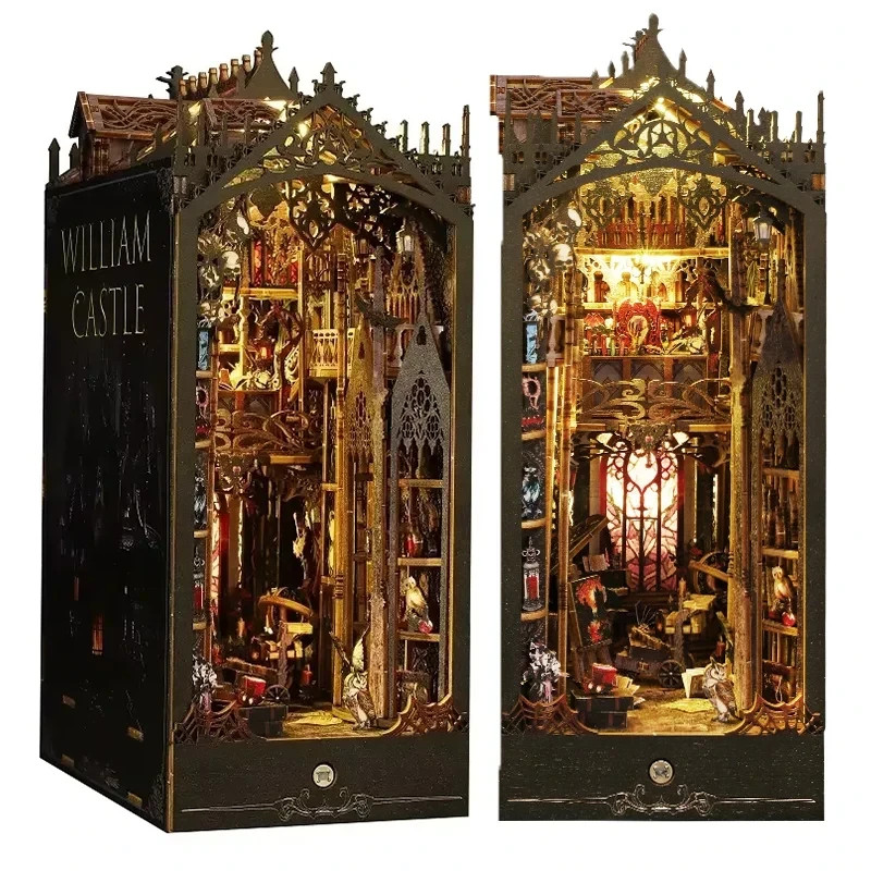 DIY Buchnische – gotisches Schloss in deinem Regal! Präzise lasergeschnittene Holzteile 🪵, UV-Druck und sensorisches LED-Licht 💡. Geeignet für Kreative ab 14 Jahren 🎨 – elegante Dekoration und stilvolles Geschenk 🎁. Das Modell spielt eine Melodie.